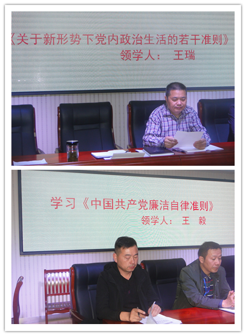 然后,副校长王瑞,总务主任王毅分别领学了《关于新形势下党内政治生活的若干准则》、《中国共产党廉洁自律准则》,给全体教师上了一堂廉政党课。副校长许力领学了《中国共产党纪律处分条例》,并布置“不忘初心、牢记使命”主题教育问题检视整改“四清单”,要求全体党员对照自身,找差距,抓落实。