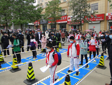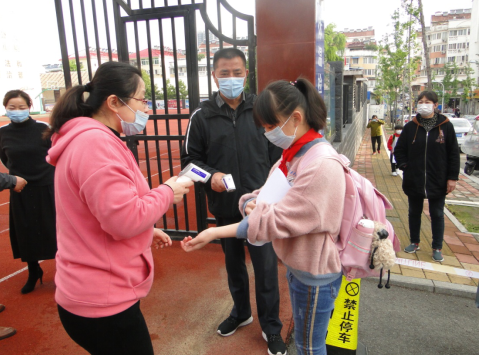 4月20日上午7时许,全体值班人员提前到岗,以饱满的工作热情迎接孩子们的归来。为保证学生安全有序进入校园,学校同时开放了东门和南门,设置了5条安全通道。在卫生防疫、公安、城管等部门的大力配合下,学生在测量体温正常后进入校园。