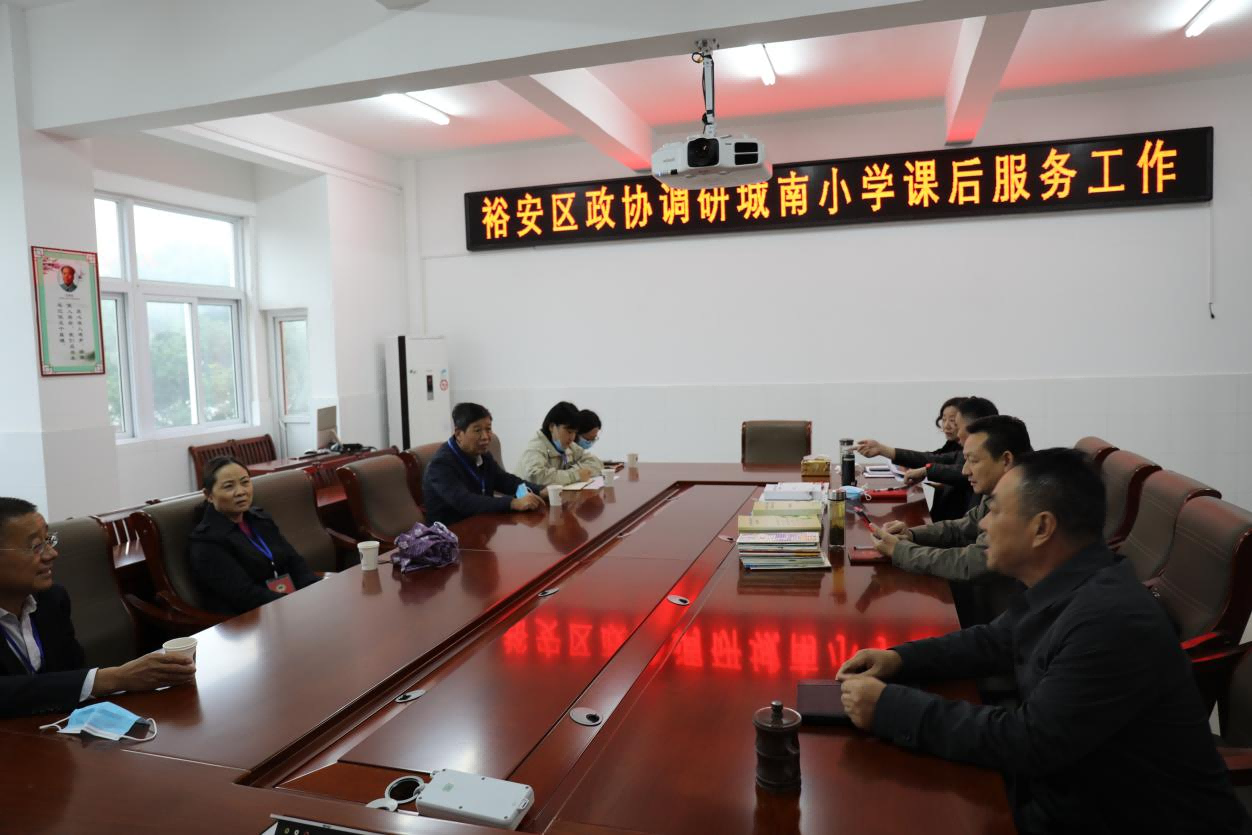10月26日下午,六安市裕安区政协副主席陶晓婉带队赴城南小学开展课后服务工作调研。区政协教科卫体委员会主任杨旭,区政协文化文史和学习委员会主任张平,区政协联络调研股股长陈田,区委教育工委书记、教体局局长王永益,区教体局基教科科长王劲松等陪同调研。