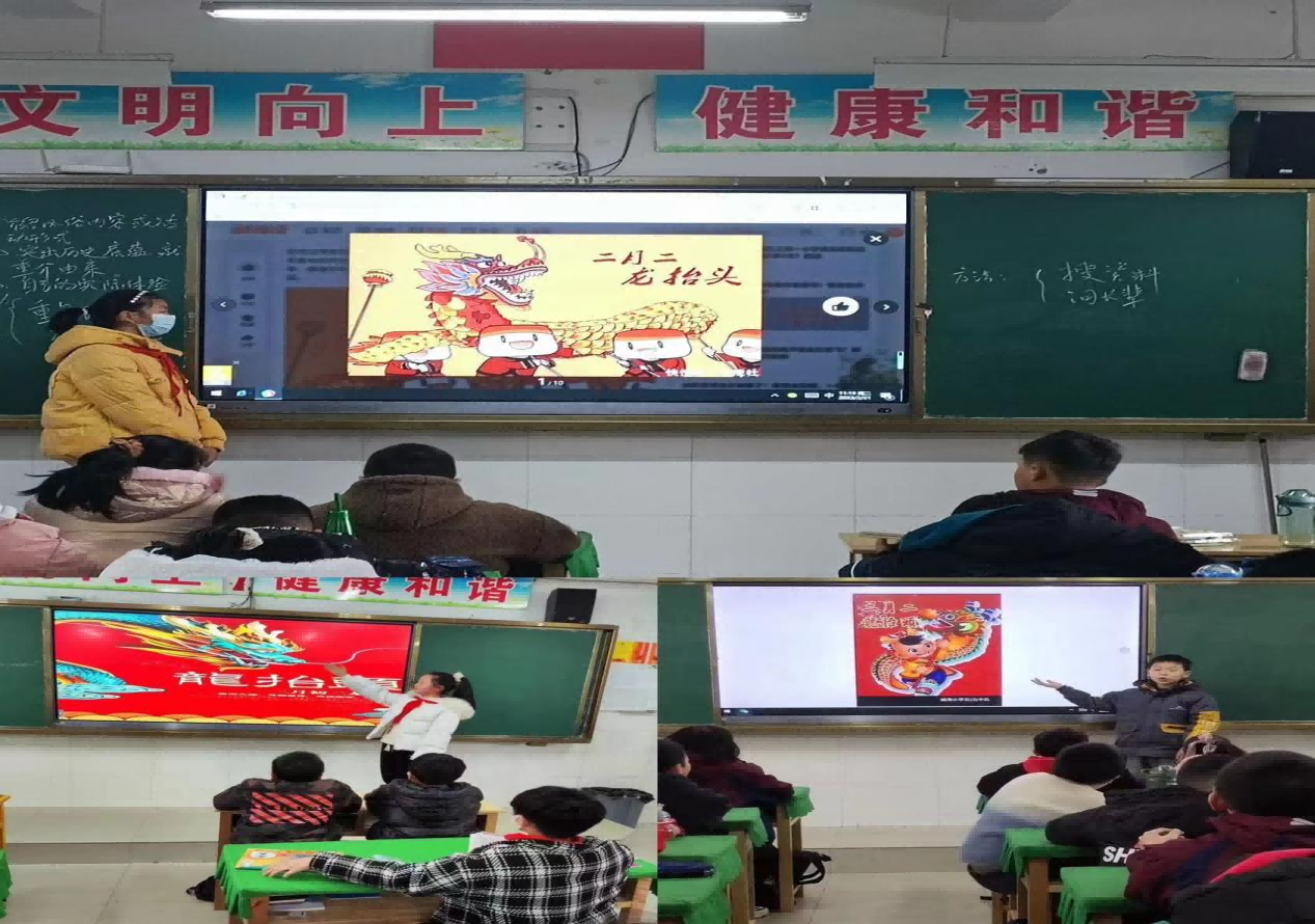 各中队辅导员老师首先利用课件为少先队员们讲解了二月二的由来、历史和习俗。龙抬头是每年农历二月初二,俗称青龙节,传说是龙抬头的日子,又被称为“春耕节”“农事节”“春龙节”,是中国民间传统节日,最早起源于伏羲氏时代,伏羲“重农桑,务耕田”,每年二月初二“皇娘送饭,御驾亲耕”。理发、吃炒豆等一系列习俗令这个身处春天的节日暖意融融。其次由各少先队员分享自己在二月二这一天所做的事情。