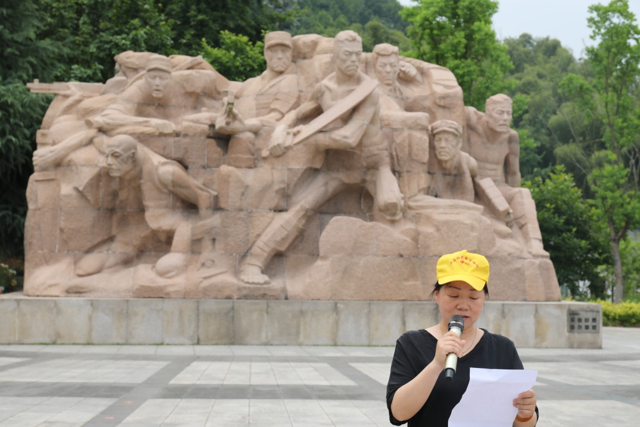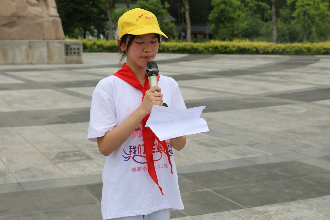 在红源广场大别山革命英雄群雕前,城南小学副校长卢洁带领学生回顾了红色历史、缅怀了革命先烈,同时对同学们进行了红色教育,让学生懂得今天美好幸福生活来之不易。她勉励大家立志成才,长大后更好的为祖国和家乡建设做贡献。